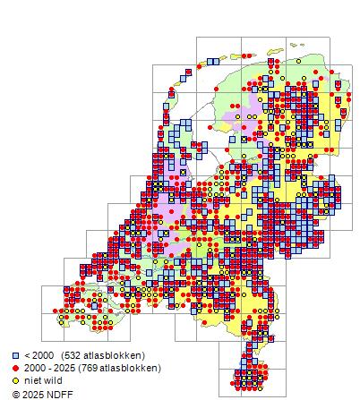 CC BY-NC-SA 3.0 NLVerspreidingNederlandPlaatselijk vrij algemeen in de Hollandse duinen, Drenthe en het oosten en zuidoosten en zeldzaam in het rivierengebied, in Gelderland, in Noord-Brabant en in Limburg. Elders zeer zeldzaam.