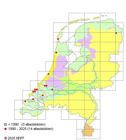 Het aantal atlasblokken (5x5 km) waarin de soort is gemeld binnen een periode van vijf jaar (vanaf 1980) of twintig jaar. Niet gecorrigeerd voor waarnemersinspanning en het aantal doorgegeven waarnemingen kan sterk variëren per periode, dus een trend in verspreiding kan hier niet direct uit worden afgelezen. Het opgegeven jaartal is het eerste jaar van de periode. Bron: gevalideerde waarnemingen uit de NDFF.