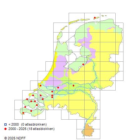 Het aantal atlasblokken (5x5 km) waarin de soort is gemeld binnen een periode van vijf jaar (vanaf 1980) of twintig jaar. Niet gecorrigeerd voor waarnemersinspanning en het aantal doorgegeven waarnemingen kan sterk variëren per periode, dus een trend in verspreiding kan hier niet direct uit worden afgelezen. Het opgegeven jaartal is het eerste jaar van de periode. Bron: gevalideerde waarnemingen uit de NDFF.