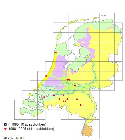 Het aantal atlasblokken (5x5 km) waarin de soort is gemeld binnen een periode van vijf jaar (vanaf 1980) of twintig jaar. Niet gecorrigeerd voor waarnemersinspanning en het aantal doorgegeven waarnemingen kan sterk variëren per periode, dus een trend in verspreiding kan hier niet direct uit worden afgelezen. Het opgegeven jaartal is het eerste jaar van de periode. Bron: gevalideerde waarnemingen uit de NDFF.