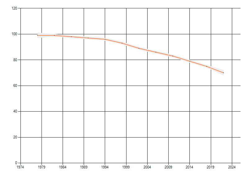 Gemiddelde trend van het aantal kilometerhokken waarin de soort voorkomt, weergegeven als indexcijfer (1975-1978 = 100). De trend is gecorrigeerd voor waarnemersinspanning en geeft de relatieve verandering in het aantal bezette kilometerhokken weer. Voor de berekening worden de data per periode van vier jaar samengenomen. In de grafiek correspondeert ieder punt met het laatste jaar van zo'n periode.