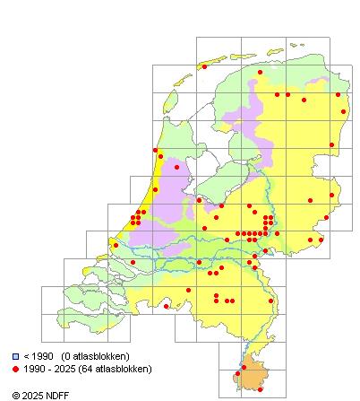 Het aantal atlasblokken (5x5 km) waarin de soort is gemeld binnen een periode van vijf jaar (vanaf 1980) of twintig jaar. Niet gecorrigeerd voor waarnemersinspanning en het aantal doorgegeven waarnemingen kan sterk variëren per periode, dus een trend in verspreiding kan hier niet direct uit worden afgelezen. Het opgegeven jaartal is het eerste jaar van de periode. Bron: gevalideerde waarnemingen uit de NDFF.
