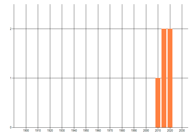 Het aantal atlasblokken (5x5 km) waarin de soort is gemeld binnen een periode van vijf jaar (vanaf 1980) of twintig jaar. Niet gecorrigeerd voor waarnemersinspanning en het aantal doorgegeven waarnemingen kan sterk variëren per periode, dus een trend in verspreiding kan hier niet direct uit worden afgelezen. Het opgegeven jaartal is het eerste jaar van de periode. Bron: gevalideerde waarnemingen uit de NDFF.