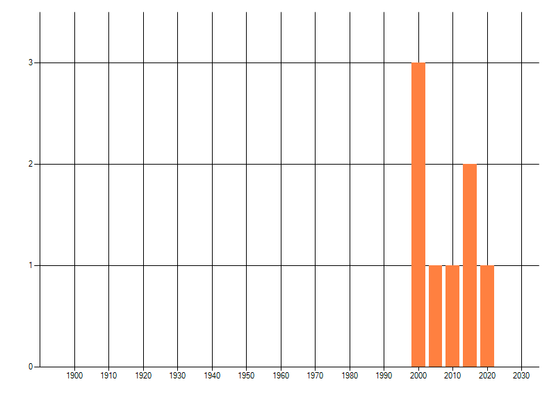 Het aantal atlasblokken (5x5 km) waarin de soort is gemeld binnen een periode van vijf jaar (vanaf 1980) of twintig jaar. Niet gecorrigeerd voor waarnemersinspanning en het aantal doorgegeven waarnemingen kan sterk variëren per periode, dus een trend in verspreiding kan hier niet direct uit worden afgelezen. Het opgegeven jaartal is het eerste jaar van de periode. Bron: gevalideerde waarnemingen uit de NDFF.