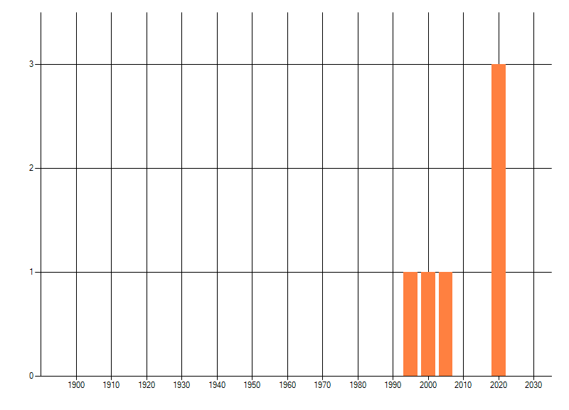 Het aantal atlasblokken (5x5 km) waarin de soort is gemeld binnen een periode van vijf jaar (vanaf 1980) of twintig jaar. Niet gecorrigeerd voor waarnemersinspanning en het aantal doorgegeven waarnemingen kan sterk variëren per periode, dus een trend in verspreiding kan hier niet direct uit worden afgelezen. Het opgegeven jaartal is het eerste jaar van de periode. Bron: gevalideerde waarnemingen uit de NDFF.