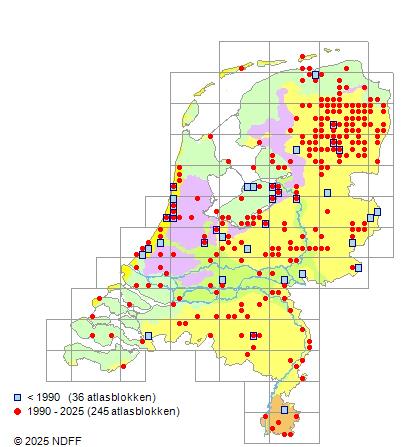 Het aantal atlasblokken (5x5 km) waarin de soort is gemeld binnen een periode van vijf jaar (vanaf 1980) of twintig jaar. Niet gecorrigeerd voor waarnemersinspanning en het aantal doorgegeven waarnemingen kan sterk variëren per periode, dus een trend in verspreiding kan hier niet direct uit worden afgelezen. Het opgegeven jaartal is het eerste jaar van de periode. Bron: gevalideerde waarnemingen uit de NDFF.