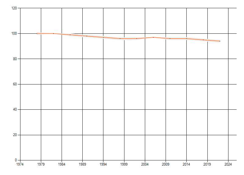 Gemiddelde trend van het aantal kilometerhokken waarin de soort voorkomt, weergegeven als indexcijfer (1975-1978 = 100). De trend is gecorrigeerd voor waarnemersinspanning en geeft de relatieve verandering in het aantal bezette kilometerhokken weer. Voor de berekening worden de data per periode van vier jaar samengenomen. In de grafiek correspondeert ieder punt met het laatste jaar van zo'n periode.