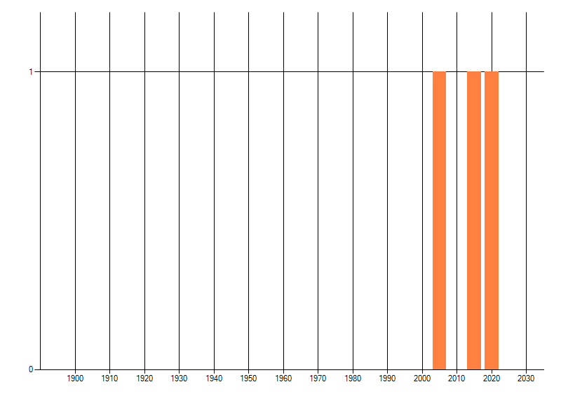 Het aantal atlasblokken (5x5 km) waarin de soort is gemeld binnen een periode van vijf jaar (vanaf 1980) of twintig jaar. Niet gecorrigeerd voor waarnemersinspanning en het aantal doorgegeven waarnemingen kan sterk variëren per periode, dus een trend in verspreiding kan hier niet direct uit worden afgelezen. Het opgegeven jaartal is het eerste jaar van de periode. Bron: gevalideerde waarnemingen uit de NDFF.