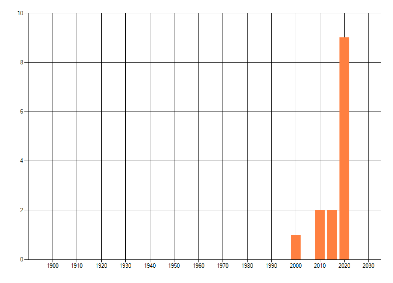 Het aantal atlasblokken (5x5 km) waarin de soort is gemeld binnen een periode van vijf jaar (vanaf 1980) of twintig jaar. Niet gecorrigeerd voor waarnemersinspanning en het aantal doorgegeven waarnemingen kan sterk variëren per periode, dus een trend in verspreiding kan hier niet direct uit worden afgelezen. Het opgegeven jaartal is het eerste jaar van de periode. Bron: gevalideerde waarnemingen uit de NDFF.