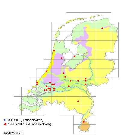 Het aantal atlasblokken (5x5 km) waarin de soort is gemeld binnen een periode van vijf jaar (vanaf 1980) of twintig jaar. Niet gecorrigeerd voor waarnemersinspanning en het aantal doorgegeven waarnemingen kan sterk variëren per periode, dus een trend in verspreiding kan hier niet direct uit worden afgelezen. Het opgegeven jaartal is het eerste jaar van de periode. Bron: gevalideerde waarnemingen uit de NDFF.