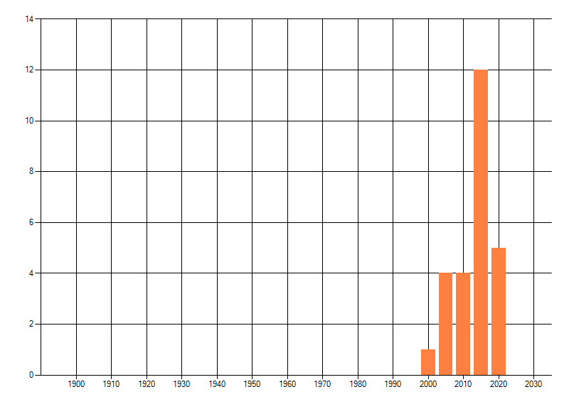 Het aantal atlasblokken (5x5 km) waarin de soort is gemeld binnen een periode van vijf jaar (vanaf 1980) of twintig jaar. Niet gecorrigeerd voor waarnemersinspanning en het aantal doorgegeven waarnemingen kan sterk variëren per periode, dus een trend in verspreiding kan hier niet direct uit worden afgelezen. Het opgegeven jaartal is het eerste jaar van de periode. Bron: gevalideerde waarnemingen uit de NDFF.