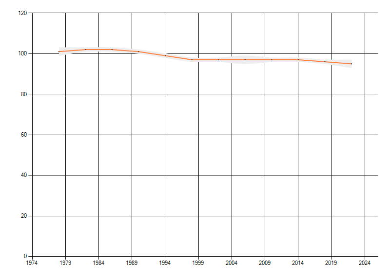 Gemiddelde trend van het aantal kilometerhokken waarin de soort voorkomt, weergegeven als indexcijfer (1975-1978 = 100).