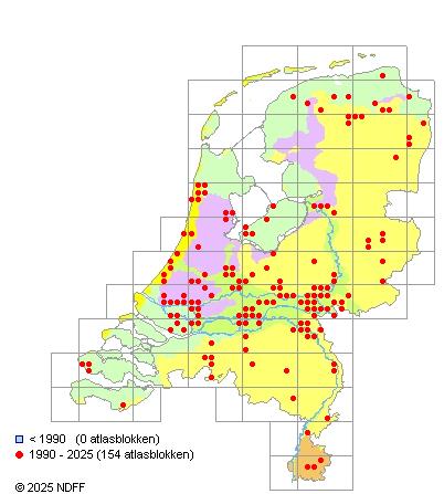 Het aantal atlasblokken (5x5 km) waarin de soort is gemeld binnen een periode van vijf jaar (vanaf 1980) of twintig jaar. Niet gecorrigeerd voor waarnemersinspanning en het aantal doorgegeven waarnemingen kan sterk variëren per periode, dus een trend in verspreiding kan hier niet direct uit worden afgelezen. Het opgegeven jaartal is het eerste jaar van de periode. Bron: gevalideerde waarnemingen uit de NDFF.