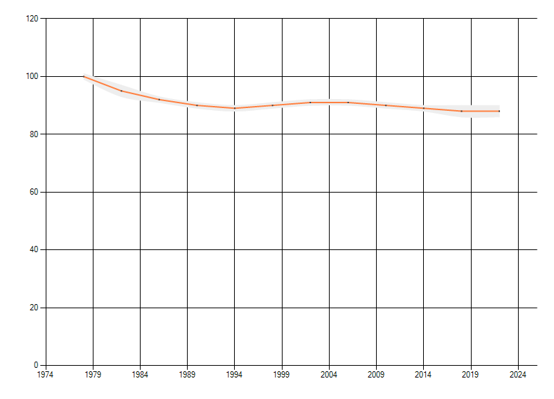 Gemiddelde trend van het aantal kilometerhokken waarin de soort voorkomt, weergegeven als indexcijfer (1975-1978 = 100). De trend is gecorrigeerd voor waarnemersinspanning en geeft de relatieve verandering in het aantal bezette kilometerhokken weer. Voor de berekening worden de data per periode van vier jaar samengenomen. In de grafiek correspondeert ieder punt met het laatste jaar van zo'n periode.