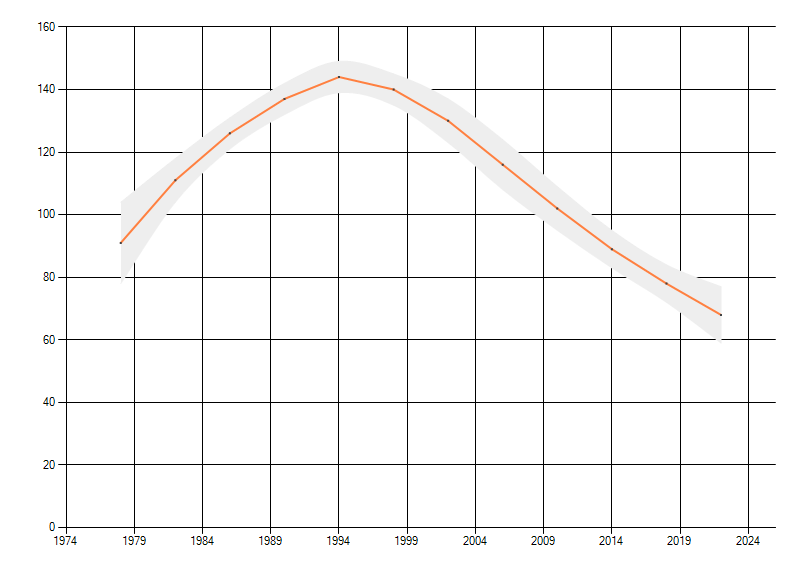 Gemiddelde trend van het aantal kilometerhokken waarin de soort voorkomt, weergegeven als indexcijfer (1975-1978 = 100). De trend is gecorrigeerd voor waarnemersinspanning en geeft de relatieve verandering in het aantal bezette kilometerhokken weer. Voor de berekening worden de data per periode van vier jaar samengenomen. In de grafiek correspondeert ieder punt met het laatste jaar van zo'n periode.