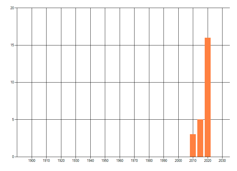 Het aantal atlasblokken (5x5 km) waarin de soort is gemeld binnen een periode van vijf jaar (vanaf 1980) of twintig jaar. Niet gecorrigeerd voor waarnemersinspanning en het aantal doorgegeven waarnemingen kan sterk variëren per periode, dus een trend in verspreiding kan hier niet direct uit worden afgelezen. Het opgegeven jaartal is het eerste jaar van de periode. Bron: gevalideerde waarnemingen uit de NDFF.
