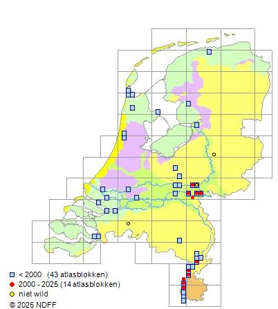 CC BY-NC-SA 3.0 NLVerspreidingNederlandZeer zeldzaam in het rivierengebied (voornamelijk in stedelijke gebieden in het zuidoosten). Vroeger ook bij Den Helder.