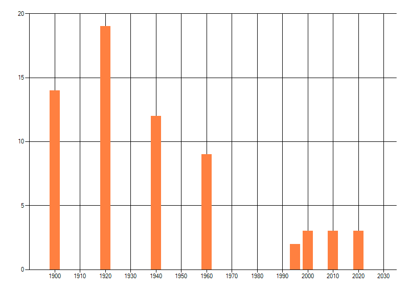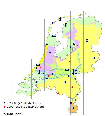 Het aantal atlasblokken (5x5 km) waarin de soort is gemeld binnen een periode van vijf jaar (vanaf 1980) of twintig jaar. Niet gecorrigeerd voor waarnemersinspanning en het aantal doorgegeven waarnemingen kan sterk variëren per periode, dus een trend in verspreiding kan hier niet direct uit worden afgelezen. Het opgegeven jaartal is het eerste jaar van de periode. Bron: gevalideerde waarnemingen uit de NDFF.