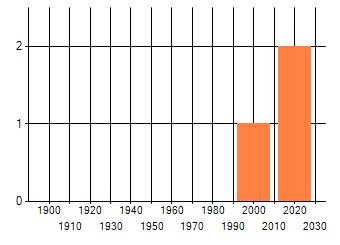Het aantal atlasblokken (5x5 km) waarin de soort is gemeld binnen een periode van vijf jaar (vanaf 1980) of twintig jaar. Niet gecorrigeerd voor waarnemersinspanning en het aantal doorgegeven waarnemingen kan sterk variëren per periode, dus een trend in verspreiding kan hier niet direct uit worden afgelezen. Het opgegeven jaartal is het eerste jaar van de periode. Bron: gevalideerde waarnemingen uit de NDFF.