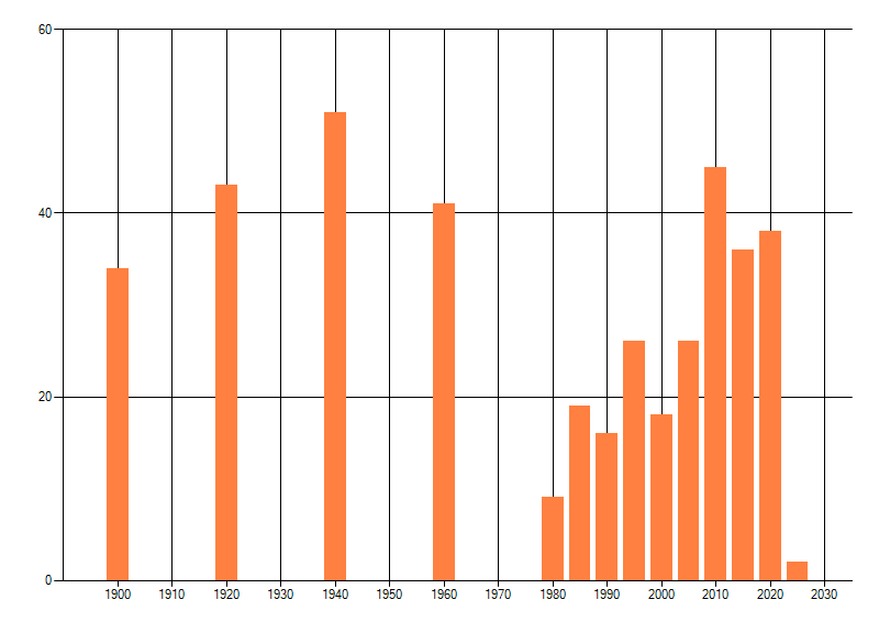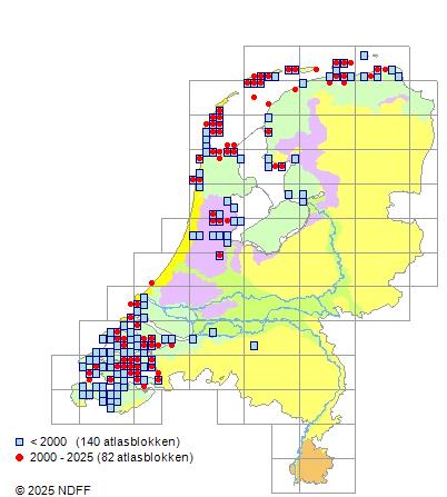 Het aantal atlasblokken (5x5 km) waarin de soort is gemeld binnen een periode van vijf jaar (vanaf 1980) of twintig jaar. Niet gecorrigeerd voor waarnemersinspanning en het aantal doorgegeven waarnemingen kan sterk variëren per periode, dus een trend in verspreiding kan hier niet direct uit worden afgelezen. Het opgegeven jaartal is het eerste jaar van de periode. Bron: gevalideerde waarnemingen uit de NDFF.