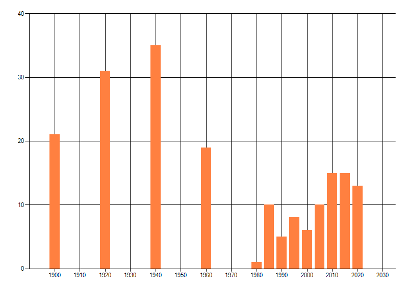 Het aantal atlasblokken (5x5 km) waarin de soort is gemeld binnen een periode van vijf jaar (vanaf 1980) of twintig jaar. Niet gecorrigeerd voor waarnemersinspanning en het aantal doorgegeven waarnemingen kan sterk variëren per periode, dus een trend in verspreiding kan hier niet direct uit worden afgelezen. Het opgegeven jaartal is het eerste jaar van de periode. Bron: gevalideerde waarnemingen uit de NDFF.