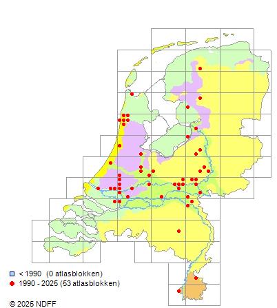 Het aantal atlasblokken (5x5 km) waarin de soort is gemeld binnen een periode van vijf jaar (vanaf 1980) of twintig jaar. Niet gecorrigeerd voor waarnemersinspanning en het aantal doorgegeven waarnemingen kan sterk variëren per periode, dus een trend in verspreiding kan hier niet direct uit worden afgelezen. Het opgegeven jaartal is het eerste jaar van de periode. Bron: gevalideerde waarnemingen uit de NDFF.