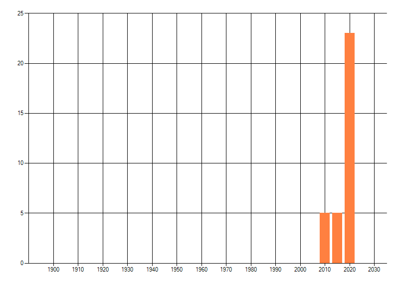 Het aantal atlasblokken (5x5 km) waarin de soort is gemeld binnen een periode van vijf jaar (vanaf 1980) of twintig jaar. Niet gecorrigeerd voor waarnemersinspanning en het aantal doorgegeven waarnemingen kan sterk variëren per periode, dus een trend in verspreiding kan hier niet direct uit worden afgelezen. Het opgegeven jaartal is het eerste jaar van de periode. Bron: gevalideerde waarnemingen uit de NDFF.