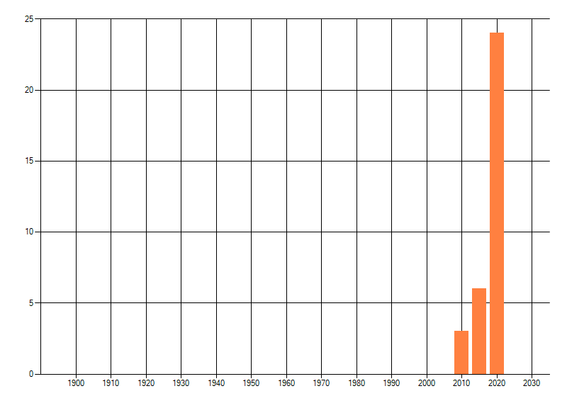 Het aantal atlasblokken (5x5 km) waarin de soort is gemeld binnen een periode van vijf jaar (vanaf 1980) of twintig jaar. Niet gecorrigeerd voor waarnemersinspanning en het aantal doorgegeven waarnemingen kan sterk variëren per periode, dus een trend in verspreiding kan hier niet direct uit worden afgelezen. Het opgegeven jaartal is het eerste jaar van de periode. Bron: gevalideerde waarnemingen uit de NDFF.