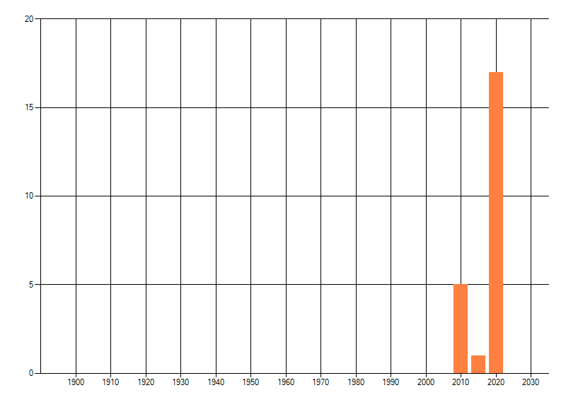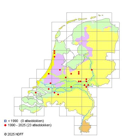 Het aantal atlasblokken (5x5 km) waarin de soort is gemeld binnen een periode van vijf jaar (vanaf 1980) of twintig jaar. Niet gecorrigeerd voor waarnemersinspanning en het aantal doorgegeven waarnemingen kan sterk variëren per periode, dus een trend in verspreiding kan hier niet direct uit worden afgelezen. Het opgegeven jaartal is het eerste jaar van de periode. Bron: gevalideerde waarnemingen uit de NDFF.