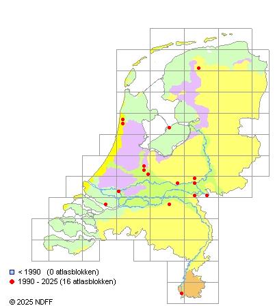 Het aantal atlasblokken (5x5 km) waarin de soort is gemeld binnen een periode van vijf jaar (vanaf 1980) of twintig jaar. Niet gecorrigeerd voor waarnemersinspanning en het aantal doorgegeven waarnemingen kan sterk variëren per periode, dus een trend in verspreiding kan hier niet direct uit worden afgelezen. Het opgegeven jaartal is het eerste jaar van de periode. Bron: gevalideerde waarnemingen uit de NDFF.