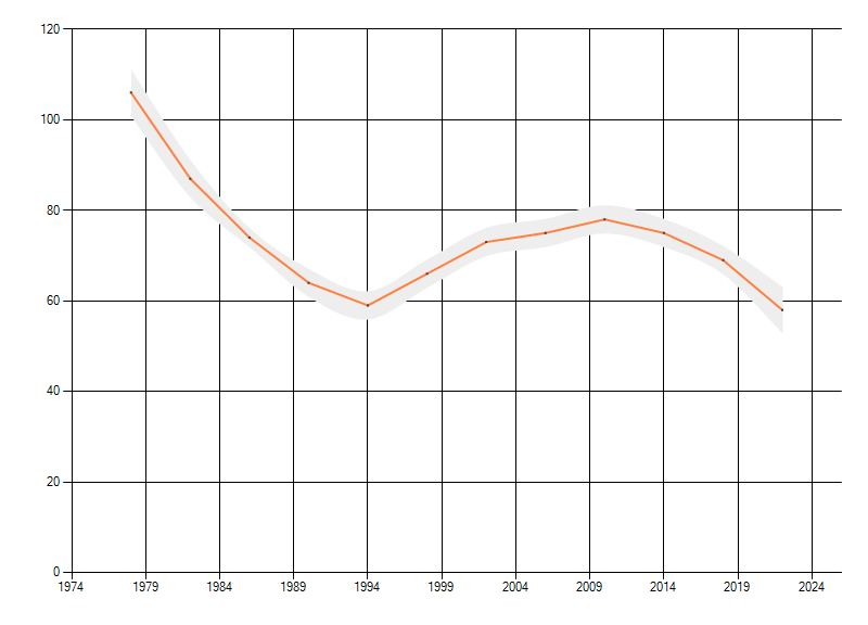 Gemiddelde trend van het aantal kilometerhokken waarin de soort voorkomt, weergegeven als indexcijfer (1975-1978 = 100). De trend is gecorrigeerd voor waarnemersinspanning en geeft de relatieve verandering in het aantal bezette kilometerhokken weer. Voor de berekening worden de data per periode van vier jaar samengenomen. In de grafiek correspondeert ieder punt met het laatste jaar van zo'n periode.