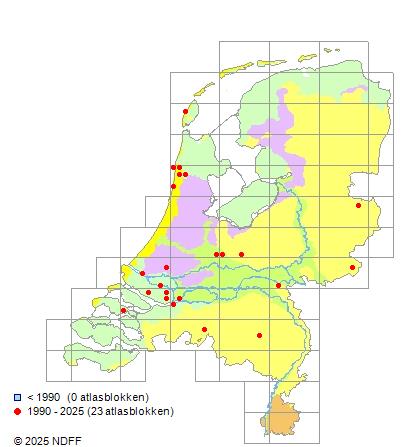 Het aantal atlasblokken (5x5 km) waarin de soort is gemeld binnen een periode van vijf jaar (vanaf 1980) of twintig jaar. Niet gecorrigeerd voor waarnemersinspanning en het aantal doorgegeven waarnemingen kan sterk variëren per periode, dus een trend in verspreiding kan hier niet direct uit worden afgelezen. Het opgegeven jaartal is het eerste jaar van de periode. Bron: gevalideerde waarnemingen uit de NDFF.