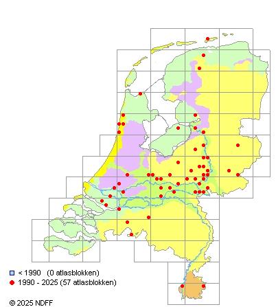 Het aantal atlasblokken (5x5 km) waarin de soort is gemeld binnen een periode van vijf jaar (vanaf 1980) of twintig jaar. Niet gecorrigeerd voor waarnemersinspanning en het aantal doorgegeven waarnemingen kan sterk variëren per periode, dus een trend in verspreiding kan hier niet direct uit worden afgelezen. Het opgegeven jaartal is het eerste jaar van de periode. Bron: gevalideerde waarnemingen uit de NDFF.