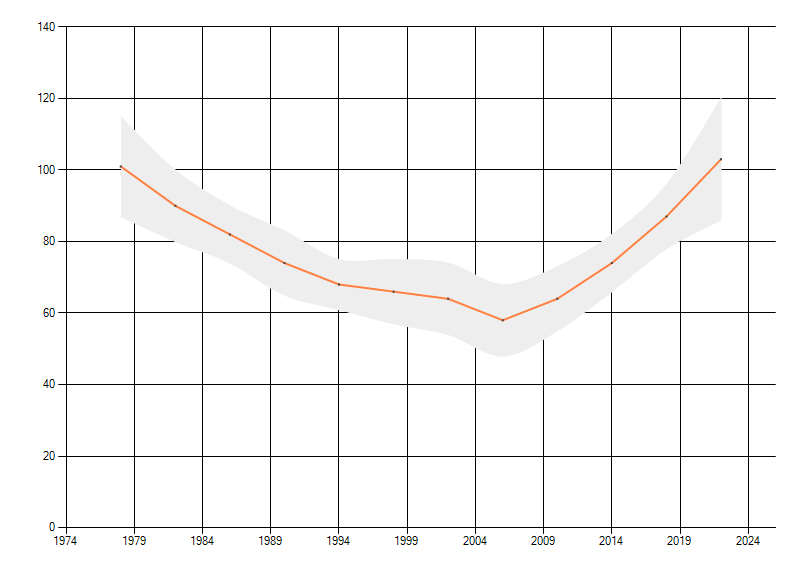 Gemiddelde trend van het aantal kilometerhokken waarin de soort voorkomt, weergegeven als indexcijfer (1975-1978 = 100). De trend is gecorrigeerd voor waarnemersinspanning en geeft de relatieve verandering in het aantal bezette kilometerhokken weer. Voor de berekening worden de data per periode van vier jaar samengenomen. In de grafiek correspondeert ieder punt met het laatste jaar van zo'n periode.