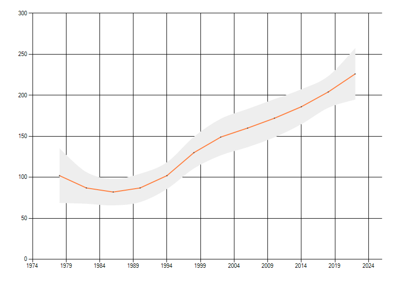 Gemiddelde trend van het aantal kilometerhokken waarin de soort voorkomt, weergegeven als indexcijfer (1975-1978 = 100). De trend is gecorrigeerd voor waarnemersinspanning en geeft de relatieve verandering in het aantal bezette kilometerhokken weer. Voor de berekening worden de data per periode van vier jaar samengenomen. In de grafiek correspondeert ieder punt met het laatste jaar van zo'n periode.