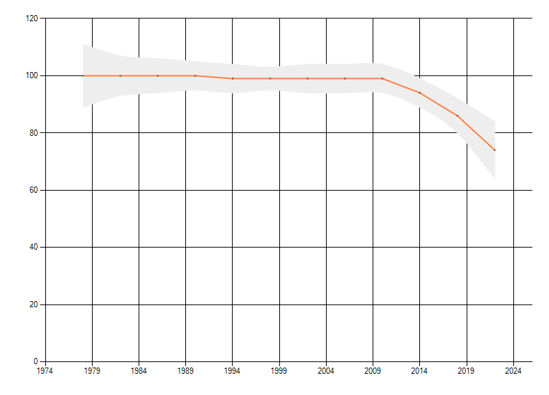 Gemiddelde trend van het aantal kilometerhokken waarin de soort voorkomt, weergegeven als indexcijfer (1975-1978 = 100).