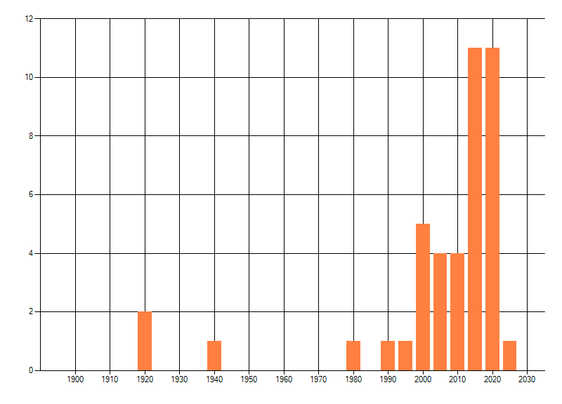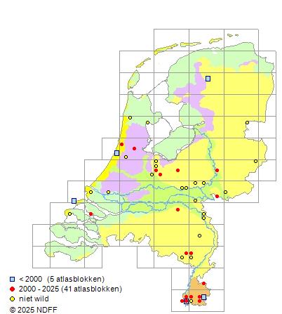 Het aantal atlasblokken (5x5 km) waarin de soort is gemeld binnen een periode van vijf jaar (vanaf 1980) of twintig jaar. Niet gecorrigeerd voor waarnemersinspanning en het aantal doorgegeven waarnemingen kan sterk variëren per periode, dus een trend in verspreiding kan hier niet direct uit worden afgelezen. Het opgegeven jaartal is het eerste jaar van de periode. Bron: gevalideerde waarnemingen uit de NDFF.