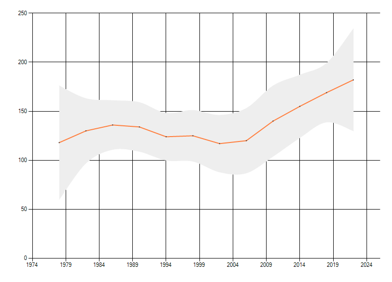 Gemiddelde trend van het aantal kilometerhokken waarin de soort voorkomt, weergegeven als indexcijfer (1975-1978 = 100).