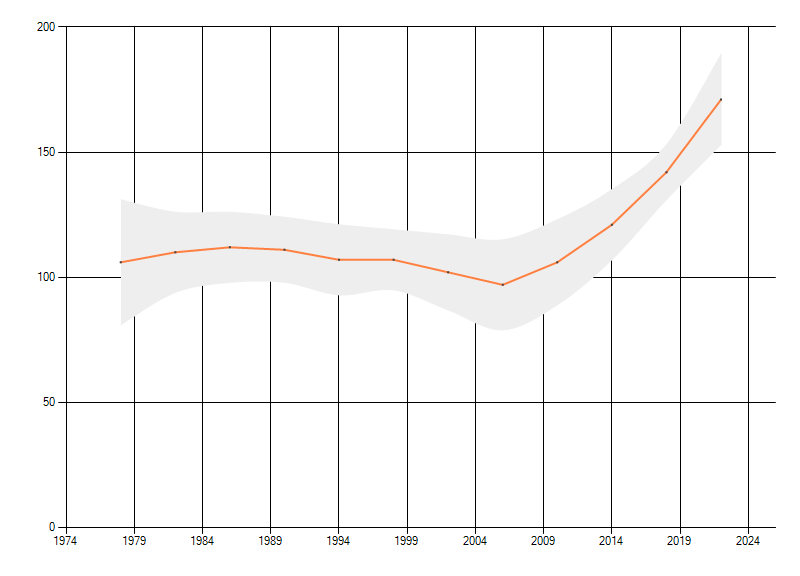 Gemiddelde trend van het aantal kilometerhokken waarin de soort voorkomt, weergegeven als indexcijfer (1975-1978 = 100).