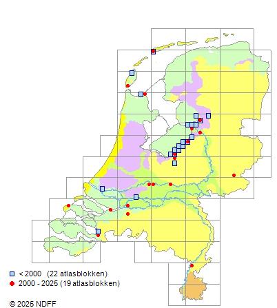 Het aantal atlasblokken (5x5 km) waarin de soort is gemeld binnen een periode van vijf jaar (vanaf 1980) of twintig jaar. Niet gecorrigeerd voor waarnemersinspanning en het aantal doorgegeven waarnemingen kan sterk variëren per periode, dus een trend in verspreiding kan hier niet direct uit worden afgelezen. Het opgegeven jaartal is het eerste jaar van de periode. Bron: gevalideerde waarnemingen uit de NDFF.