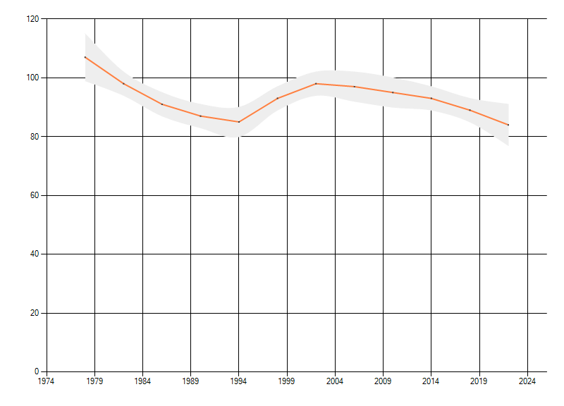 Gemiddelde trend van het aantal kilometerhokken waarin de soort voorkomt, weergegeven als indexcijfer (1975-1978 = 100).