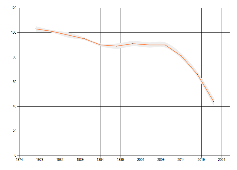Gemiddelde trend van het aantal kilometerhokken waarin de soort voorkomt, weergegeven als indexcijfer (1975-1978 = 100).