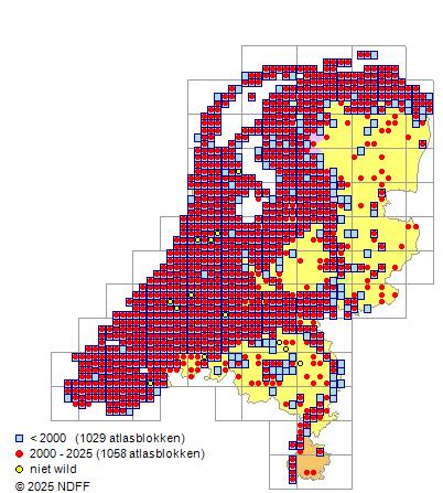 CC BY-NC-SA 3.0 NLVerspreidingNederlandAlgemeen in het westen en noorden van het land in een ongeveer 50 kilometer brede strook langs de Noordzeekust, vrij algemeen in het IJsselmeergebied en het rivierengebied. Elders zeer zeldzaam.