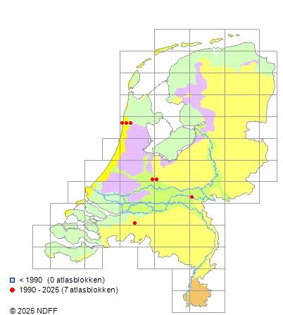 Het aantal atlasblokken (5x5 km) waarin de soort is gemeld binnen een periode van vijf jaar (vanaf 1980) of twintig jaar. Niet gecorrigeerd voor waarnemersinspanning en het aantal doorgegeven waarnemingen kan sterk variëren per periode, dus een trend in verspreiding kan hier niet direct uit worden afgelezen. Het opgegeven jaartal is het eerste jaar van de periode. Bron: gevalideerde waarnemingen uit de NDFF.