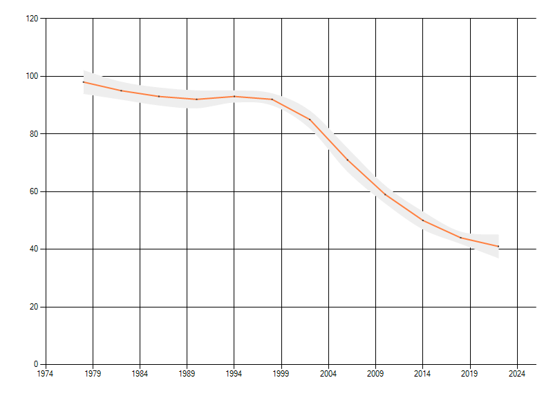 Gemiddelde trend van het aantal kilometerhokken waarin de soort voorkomt, weergegeven als indexcijfer (1975-1978 = 100). De trend is gecorrigeerd voor waarnemersinspanning en geeft de relatieve verandering in het aantal bezette kilometerhokken weer. Voor de berekening worden de data per periode van vier jaar samengenomen. In de grafiek correspondeert ieder punt met het laatste jaar van zo'n periode.