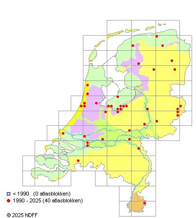 Het aantal atlasblokken (5x5 km) waarin de soort is gemeld binnen een periode van vijf jaar (vanaf 1980) of twintig jaar. Niet gecorrigeerd voor waarnemersinspanning en het aantal doorgegeven waarnemingen kan sterk variëren per periode, dus een trend in verspreiding kan hier niet direct uit worden afgelezen. Het opgegeven jaartal is het eerste jaar van de periode. Bron: gevalideerde waarnemingen uit de NDFF.