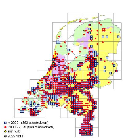 CC BY-NC-SA 3.0 NLVerspreidingNederlandPlaatselijk vrij algemeen in Zuid-Limburg, vrij zeldzaam in het rivierengebied, aangrenzende laagveengebieden en de Kempen en zeldzaam in Zeeland. Elders zeer zeldzaam. Niet op de waddeneilanden.