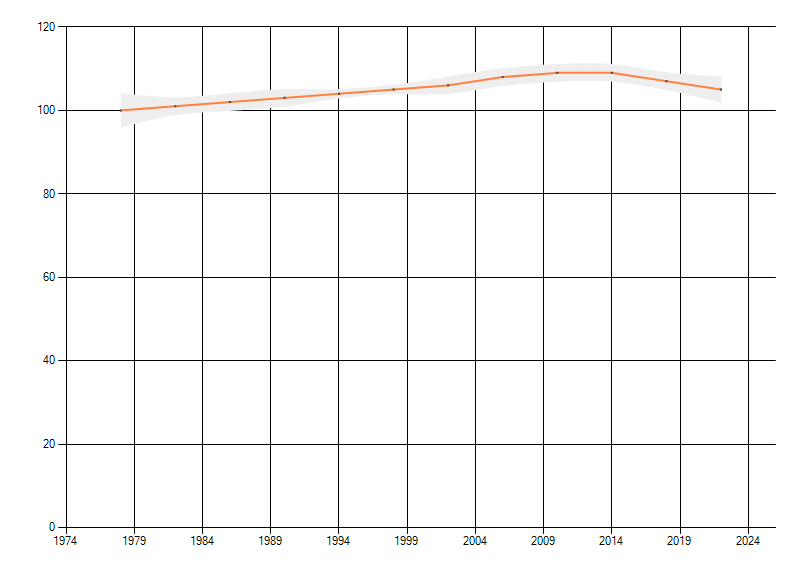 Gemiddelde trend van het aantal kilometerhokken waarin de soort voorkomt, weergegeven als indexcijfer (1975-1978 = 100).