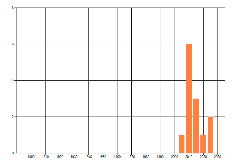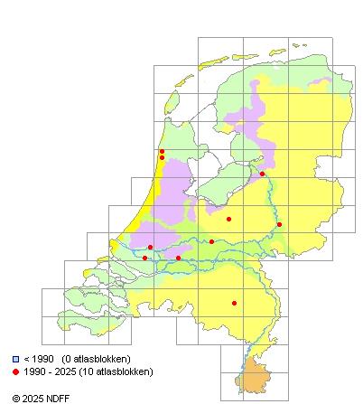 Het aantal atlasblokken (5x5 km) waarin de soort is gemeld binnen een periode van vijf jaar (vanaf 1980) of twintig jaar. Niet gecorrigeerd voor waarnemersinspanning en het aantal doorgegeven waarnemingen kan sterk variëren per periode, dus een trend in verspreiding kan hier niet direct uit worden afgelezen. Het opgegeven jaartal is het eerste jaar van de periode. Bron: gevalideerde waarnemingen uit de NDFF.