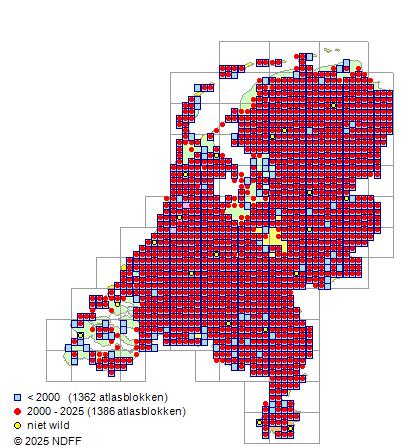 CC BY-NC-SA 3.0 NLVerspreidingNederlandAlgemeen in laagveengebieden en in het aangrenzende rivierengebied. Elders vrij algemeen, maar vrij zeldzaam in Zuid-Limburg en zeldzaam in het noordelijk zeekleigebied en in Zeeland.
